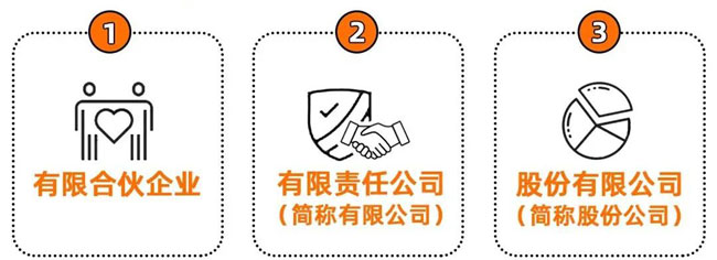 现在市场中90%的企业都集中在这三种类型,分别是有限合伙企业、有限责任公司(简称有限公司)、股份有限公司(简称股份公司)。