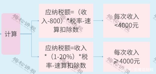 涉税提示:企业需取得合规发票方可税前扣除,个人如办理了临时税务登记,月收入15万元(季度45万元)以下可免征增值税;企业每次支付劳务报酬时,应按20%~40%的税率预扣预缴个人所得税,计算方法如下: